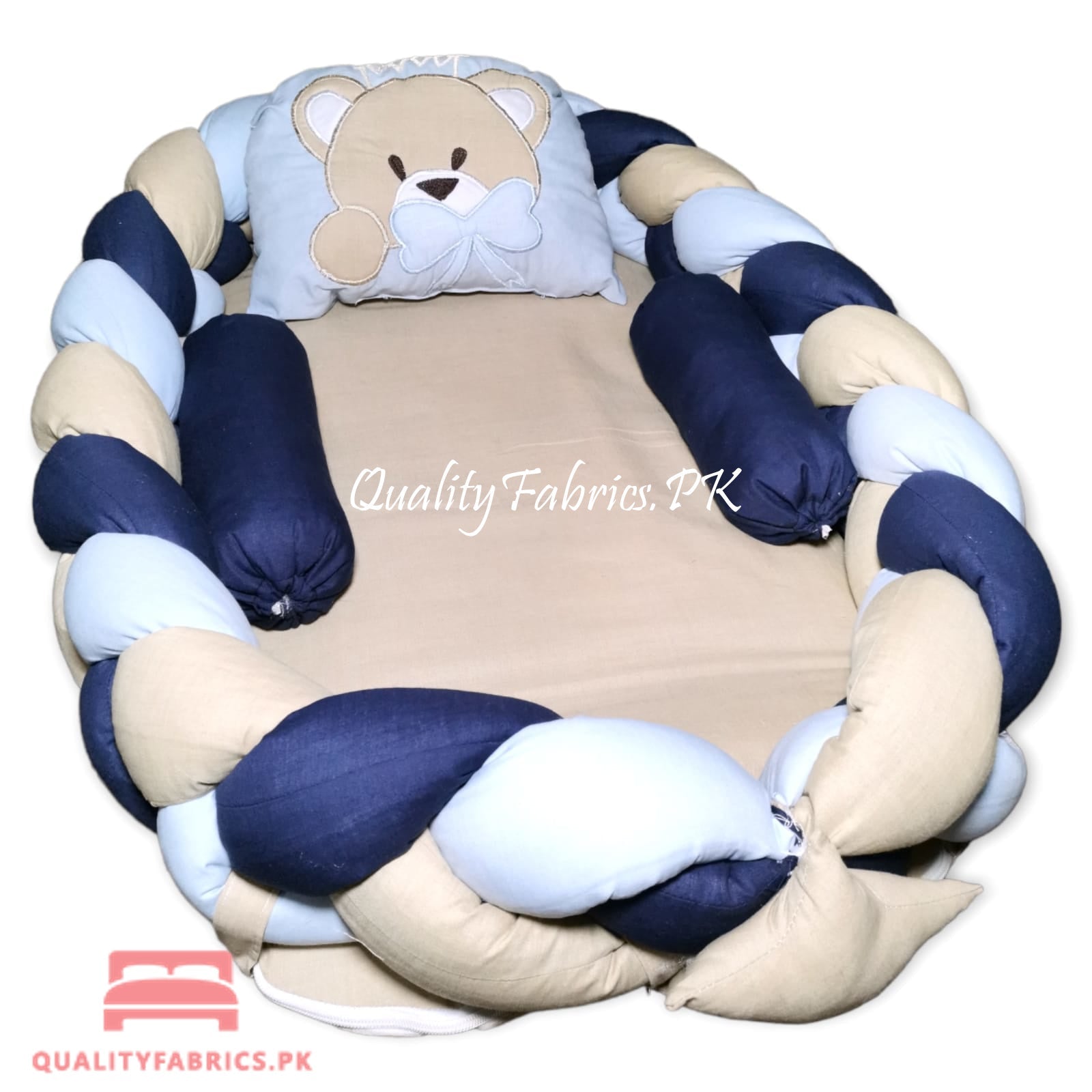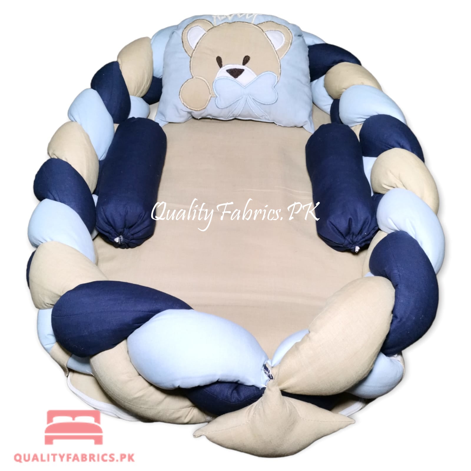 Transform your newborn's sleep routine with the luxurious comfort and stylish design of our Bear Theme Embroidered Braided Snuggle Bed. Trust Qualityfabrics.pk to provide the best in comfort and care for your little one.