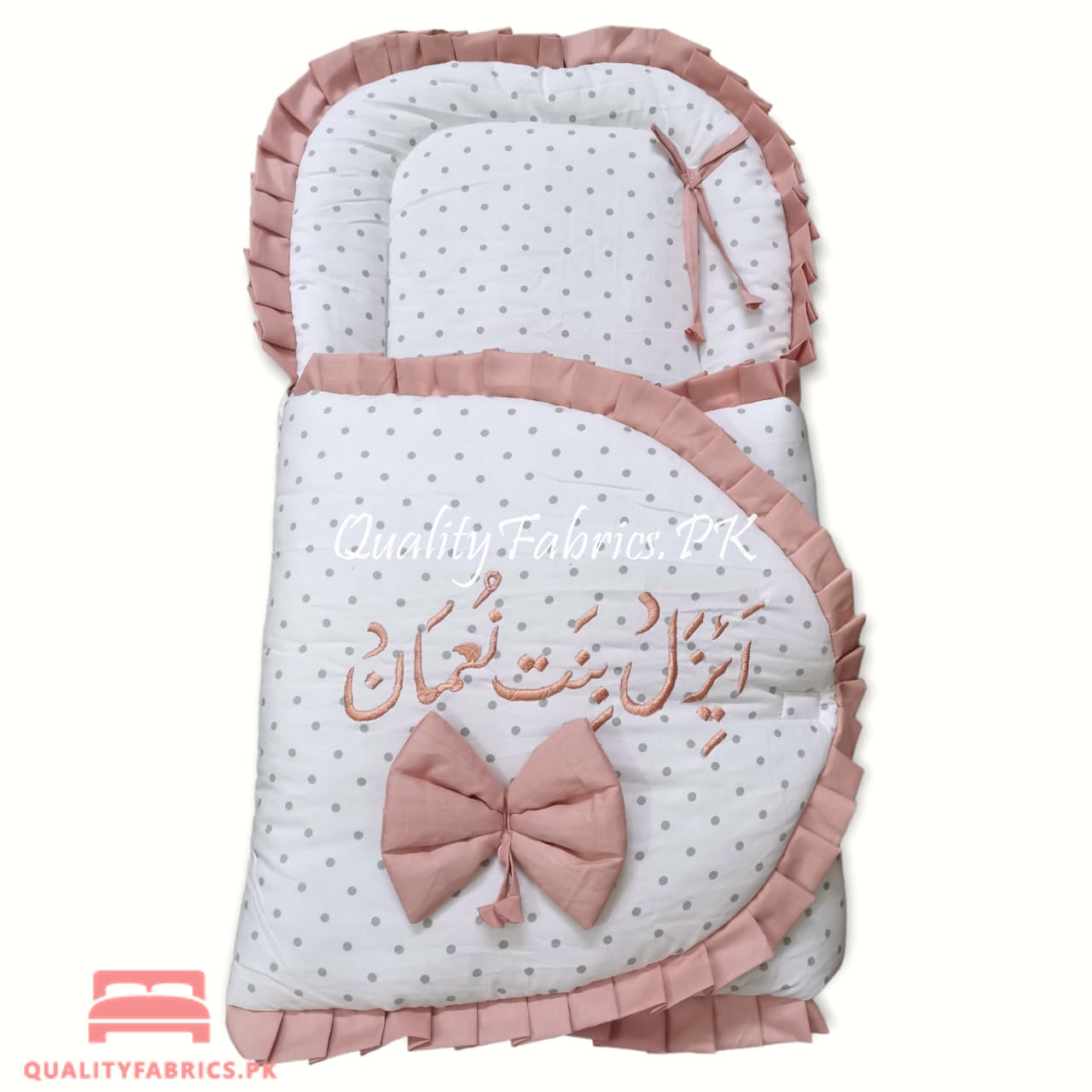 Give your little one the ultimate comfort with our premium Braided Snuggle Bed and Newborn Sleeping Bag from Qualityfabrics.pk. Designed to combine style and function, these essential items provide a secure and cozy environment, perfect for your newborn’s restful sleep. We also offer customization options to add your baby’s name in both Arabic and English styles.