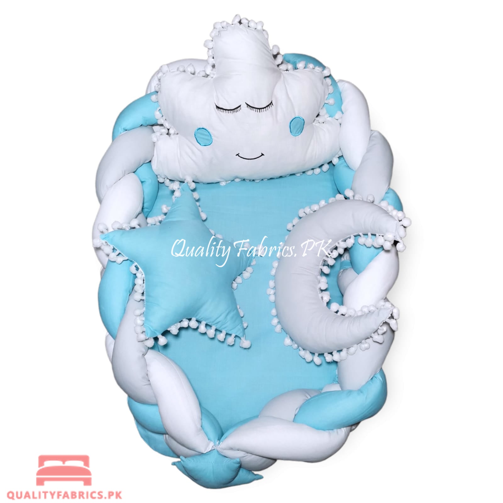Give your little one the ultimate comfort with our newly designed Braided Snuggle Bed from Qualityfabrics.pk. Combining style and function, this braided snuggle bed offers a secure and cozy environment, perfect for your newborn’s restful sleep. The set now includes charming, embroidered smiley faces on the cloud pillow, star, and moon, making it even more attractive and unique.