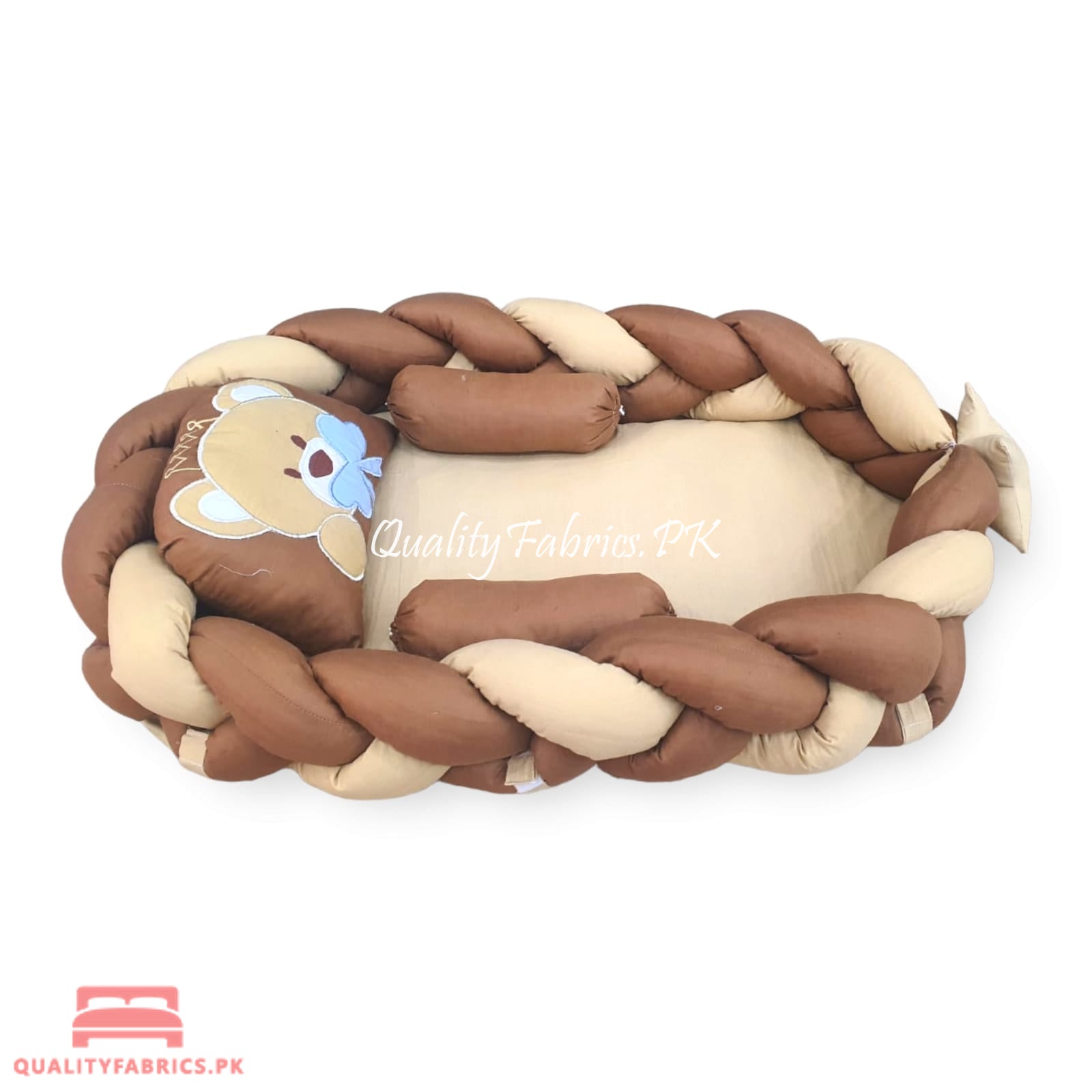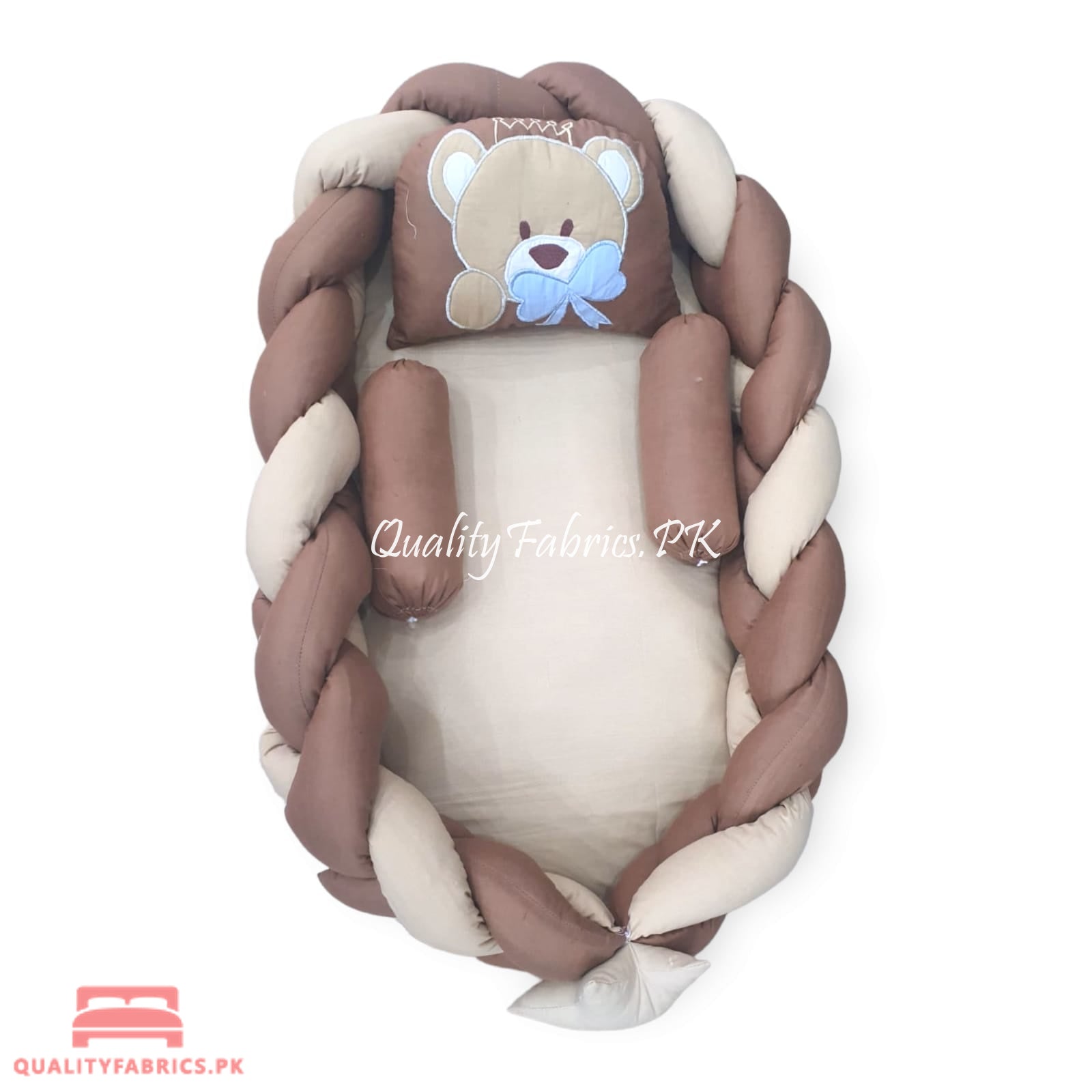 Transform your newborn's sleep routine with the luxurious comfort and stylish design of our Bear Theme Embroidered Braided Snuggle Bed. Trust Qualityfabrics.pk to provide the best in comfort and care for your little one.