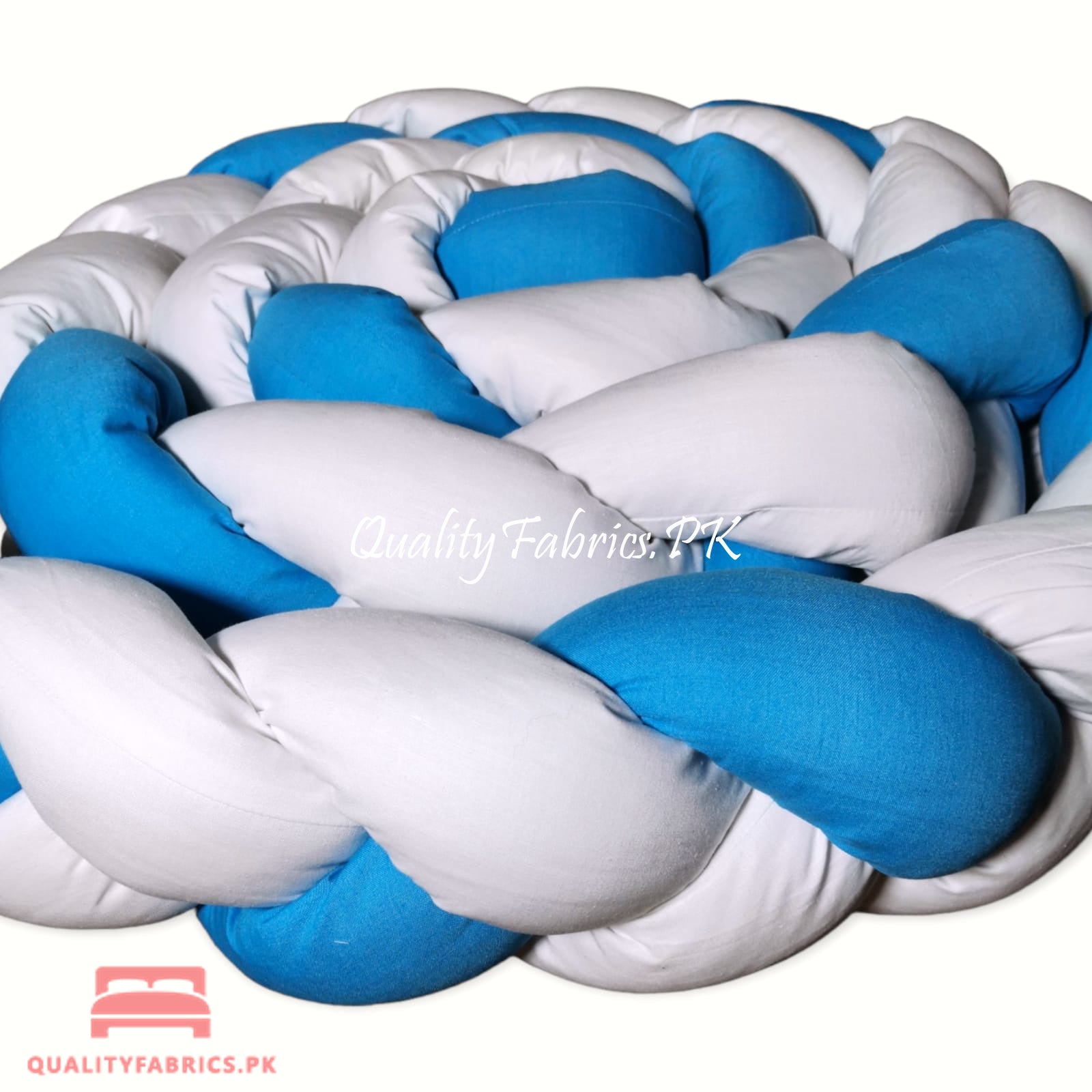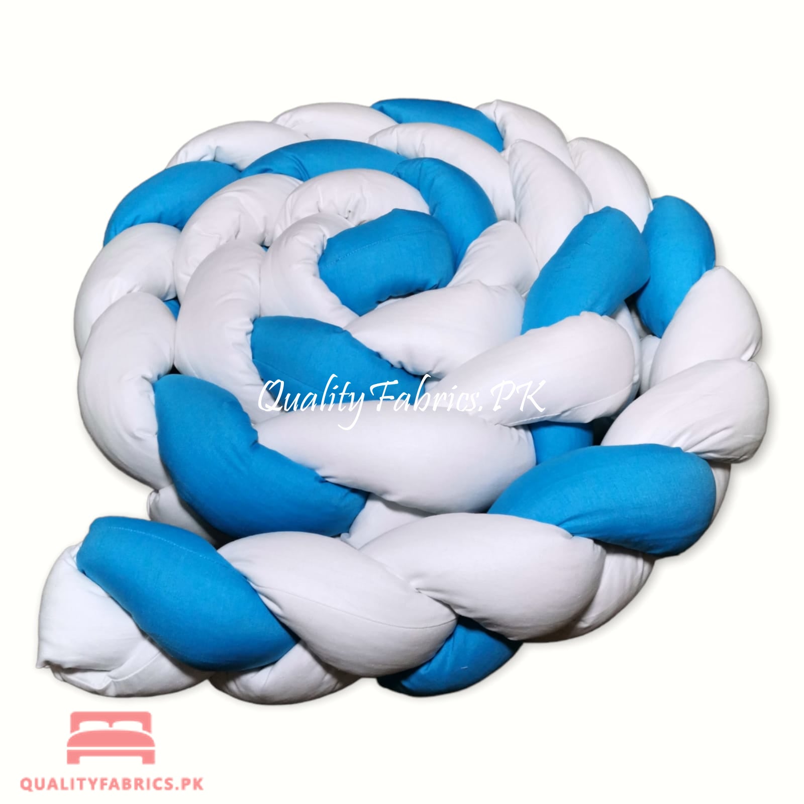 Braided bumper is a modern protective accessory, 140 inches long and 8 inches high. The bumper is made of pure cotton, filled with anti-allergic fibre balls. The braid can be wrapped around the entire inside of the crib and it will give your baby protection, comfort and a sense of security. The baby will feel more comfortable in the crib than in the open space and will be more satisfied. The baby’s calmer sleep will be guaranteed. The bumper can also be used as a protective playpen for playing outside the crib or as a barrier on the first large bed. Our QualityFabrics.PK braided bumper is suitable for children from birth. It is also a good gift for future moms.