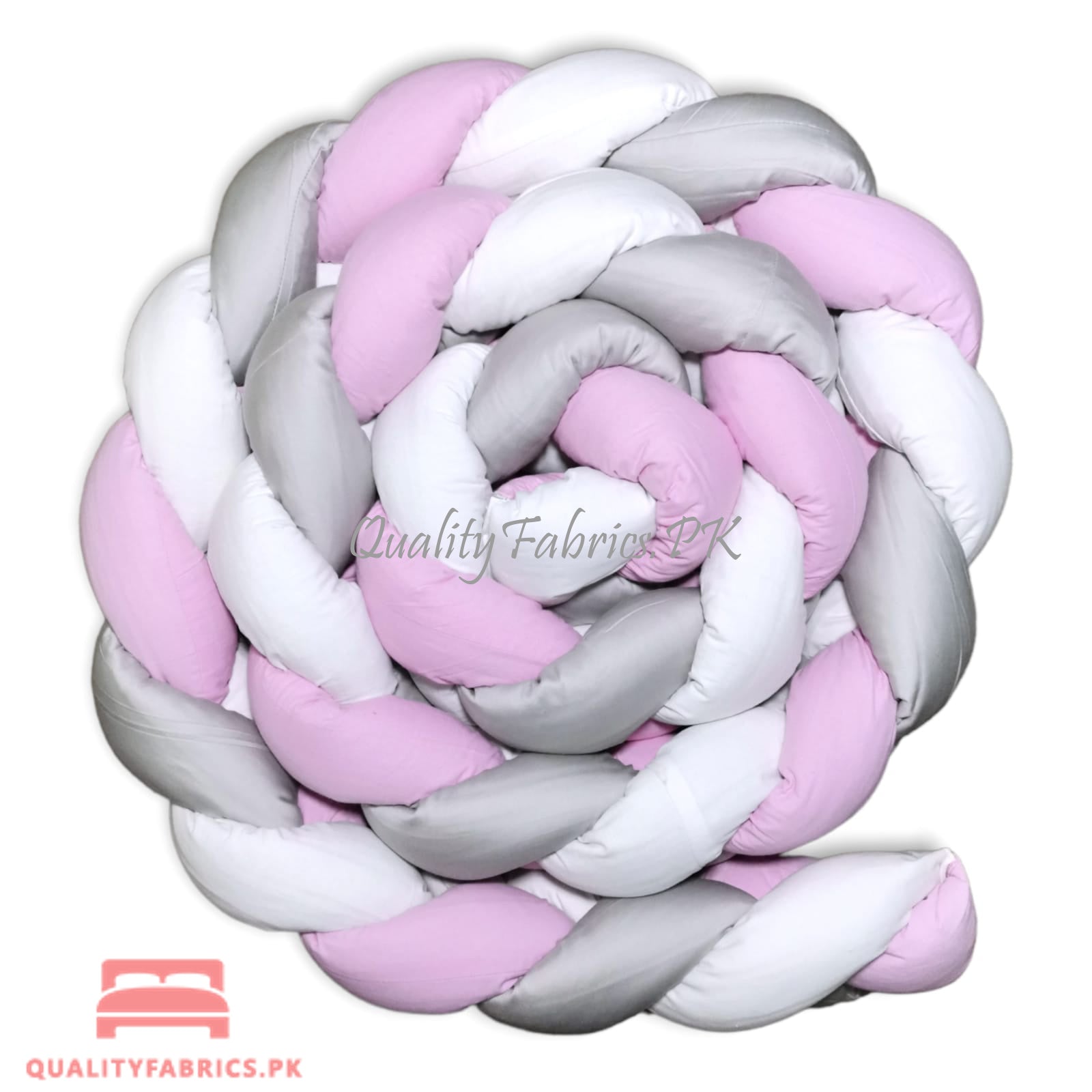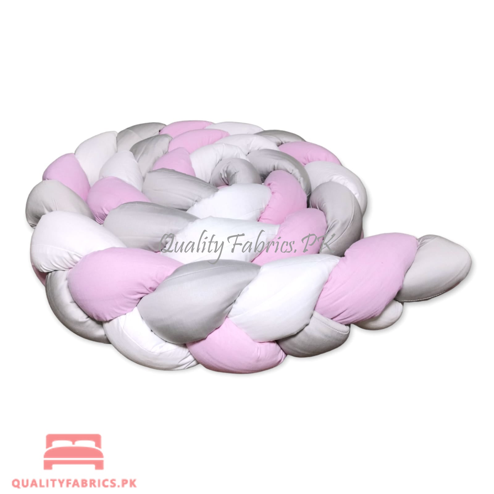 Braided bumper is a modern protective accessory, 140 inches long and 8 inches high. The bumper is made of pure cotton, filled with anti-allergic fibre balls. The braid can be wrapped around the entire inside of the crib and it will give your baby protection, comfort and a sense of security. The baby will feel more comfortable in the crib than in the open space and will be more satisfied. The baby’s calmer sleep will be guaranteed. The bumper can also be used as a protective playpen for playing outside the crib or as a barrier on the first large bed. Our QualityFabrics.PK braided bumper is suitable for children from birth. It is also a good gift for future moms.
