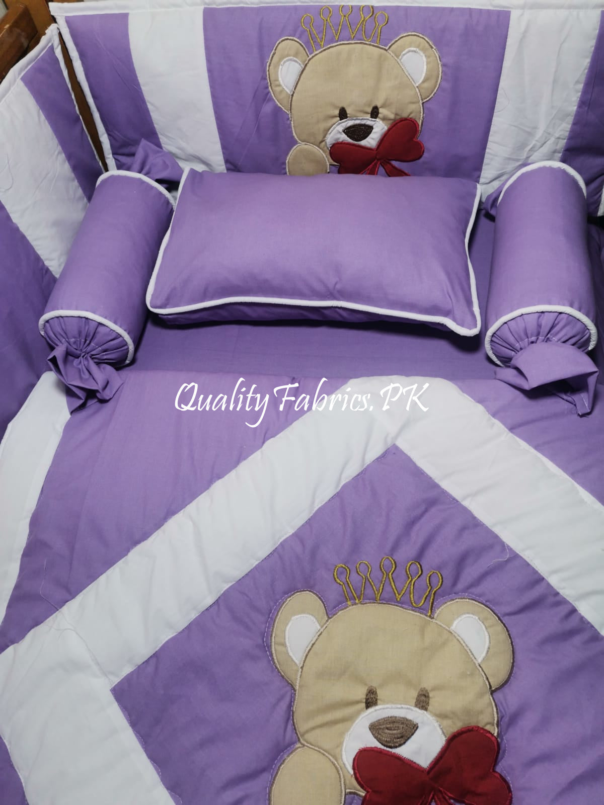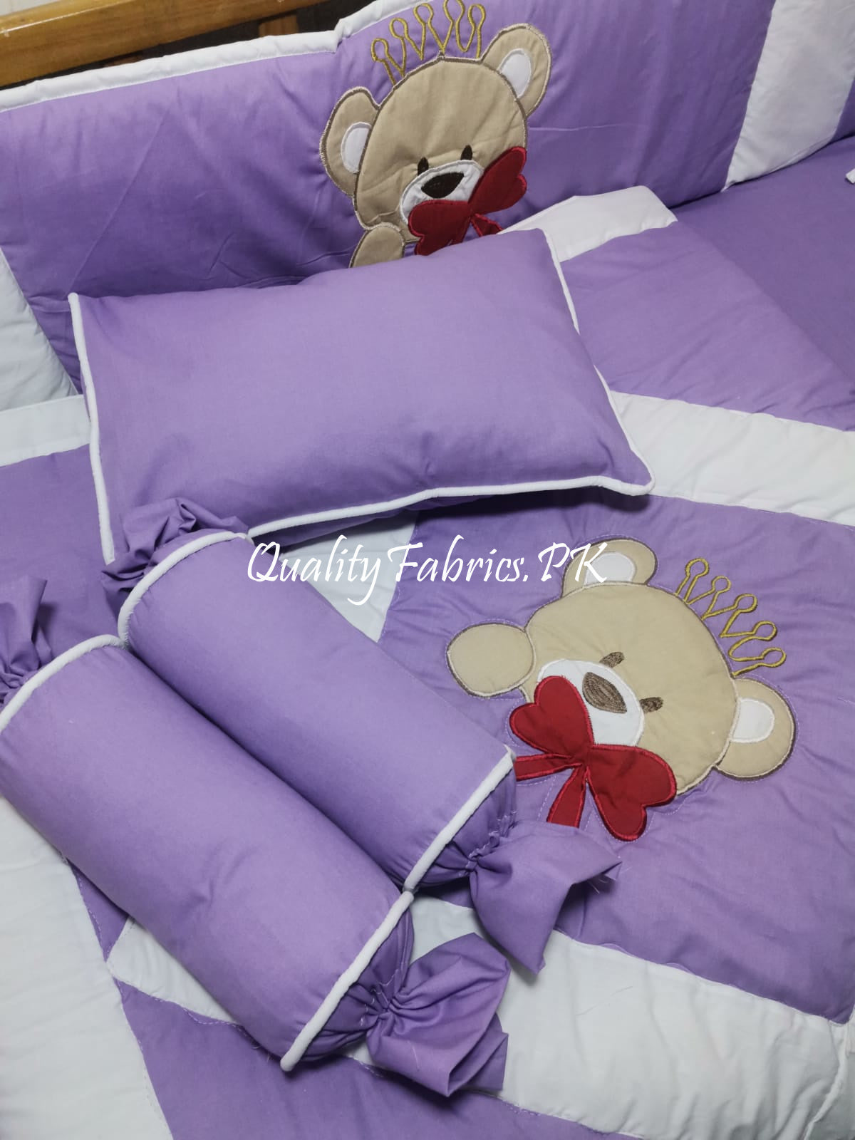 Transform your little one's cot into a cozy and stylish retreat with our 9-Piece Cot Bedding Set from Qualityfabrics.pk. Made from 100% pure cotton, this set is designed to offer unmatched comfort, safety, and versatility for newborns up to toddlers. The set features a special bear embroidery on the bumper and quilt, adding a unique touch to your nursery.